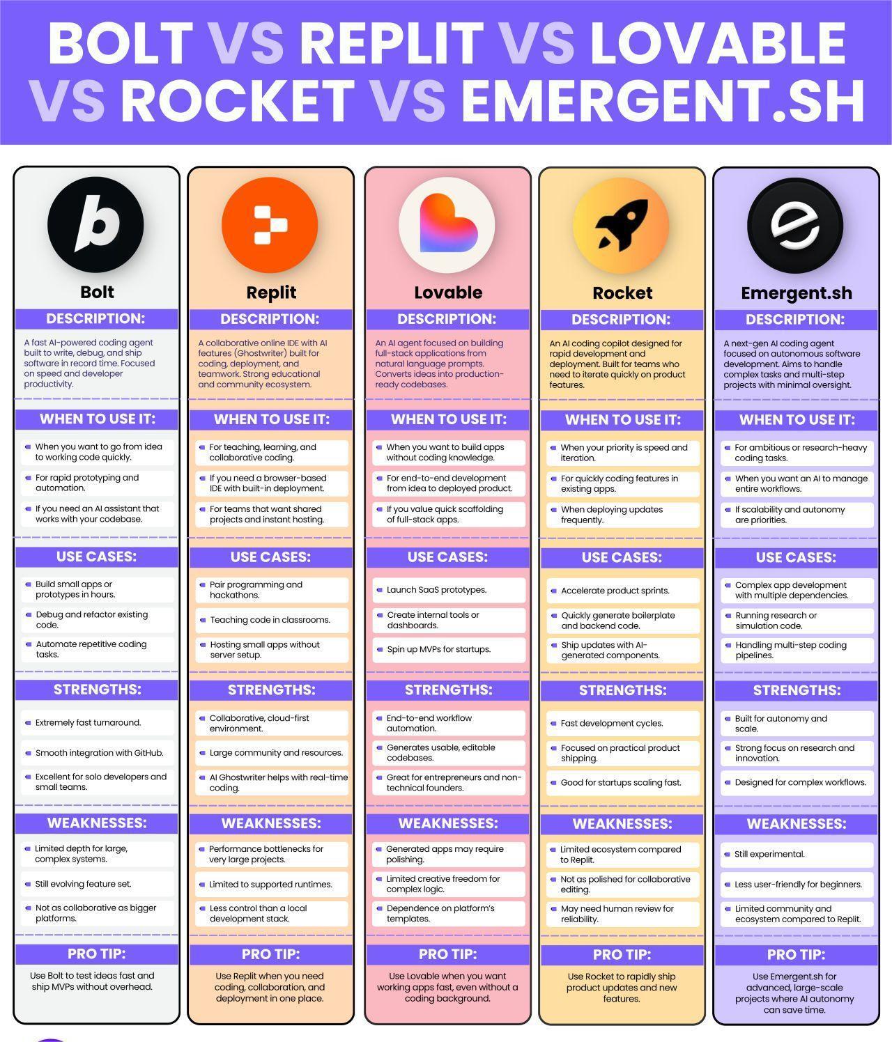 /image prompt: Compare Bolt, Replit, Lovable, Rocket, and Emergent across speed, automation, collaboration, and scalability. Highlight each platform’s strengths, ideal use cases, and how to choose the best one for building smarter AI-powered projects.
